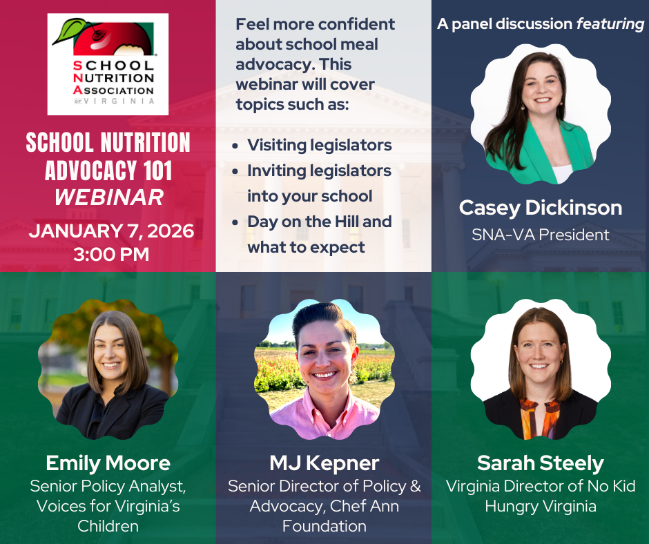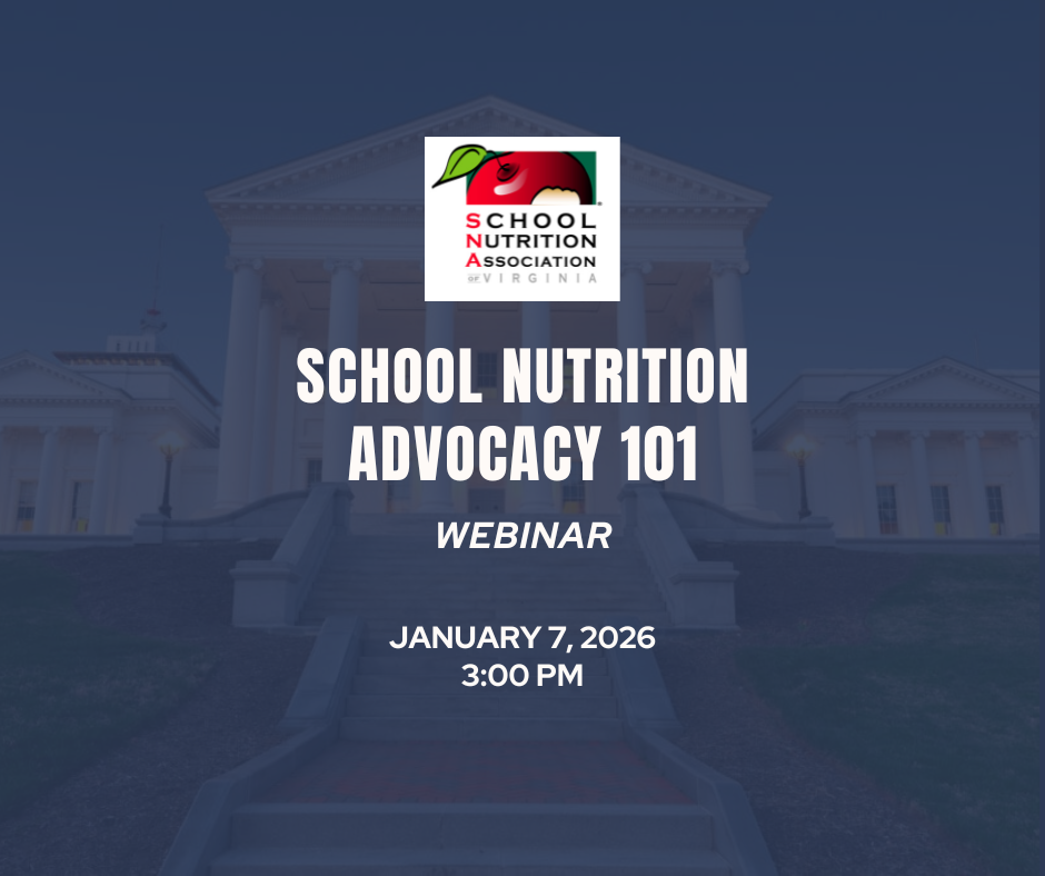 Whether you’re new to advocacy or looking to sharpen your skills, this webinar will guide you through practical ways to make your voice heard. We’ll walk through how to confidently visit legislators, tips for inviting them into your school to see meal programs in action, and what to expect during SNA-VA’s Day on the Hill. Join us to learn simple strategies, real-world examples, and tools you can use to advocate for nutritious meals and strong school nutrition programs across Virginia.