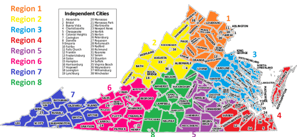 · Region VIII: Amherst, Appomattox, Buckingham, Campbell, Charlotte, Danville, Fluvanna, Halifax, Lynchburg, Nelson, Pittsylvania, Prince Edward, South Boston
